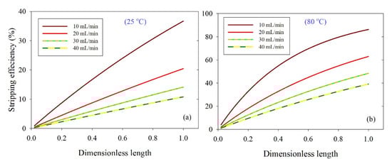 The effect of solvent liquid flow rate on stripping efficiency along the membrane dimensionless length at 25 and 80 °C is depicted in Figure 7. Results revealed that the increase in solvent flow rate at low temperature (25 °C) has an insignificant increase in the CO2 stripping efficiency; by contrast, at high temperatures, there is a significant increase in the stripping efficiency. That is attributed to the noteworthy impact of temperature on the CO2 solubility of absorbed CO2 in liquid solvents. As previously mentioned, the CO2 solubility is inversely proportional to temperature. Hence at high temperatures, the CO2 solubility decreases and CO2 escapes from the solvent and is brushed by nitrogen-sweeping gas.