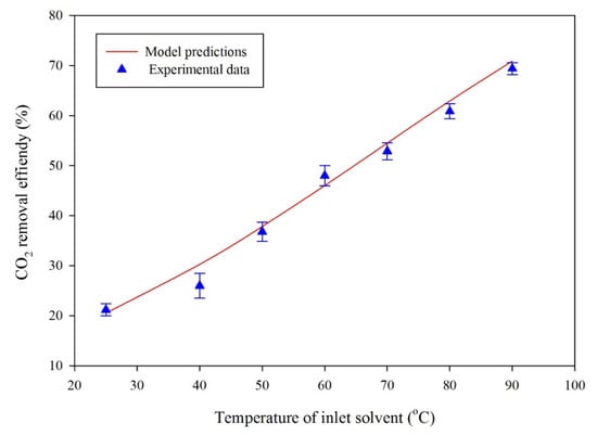 For the model validation, the experimental data of the CO2 percent removal efficiency as a function of temperature (Figure 8) and CO2 removal flux as a function of liquid feed flow rate (Figure 9) were plotted and compared with the simulation predictions. The experimental results are presented with standard error bars. Figure 8 illustrates the influence of rich solvent temperature on the percentage removal of CO2. The experimental results agreed with simulation predictions. As the PG rich solvent temperature increases, the removal percentage of CO2 increases due to decreasing CO2 solubility in liquid with temperature.