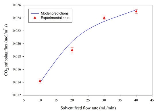 Figure 9 illustrates the comparison between experimental data and simulation results for the effect of the solvent circulation rate on CO2 stripping flux. The temperature and gas feed rate were kept constant at 80 °C and 100 mL/min, respectively. The experimental results were presented with standard error bars. Based on the experimental error bars in Figure 8 and Figure 9, the experimental results and simulation predictions were in good agreement between the experimental and simulation results. The percent efficiency was calculated as follows: