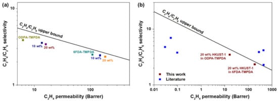 | ODPA-TMPDA + 20 wt% HKUST-1 | 16.0 ± 0.2 | 3.4 ± 0.2 |