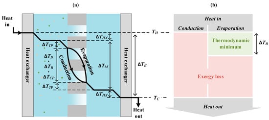 (a) Schematic representation of a single effect membrane distillation process. The effect consists of a heat-exchanging surface that transfers heat from the heater to the feed water; a porous hydrophobic membrane that facilitates the vapor transport from the feed to the permeate; and a heat-exchanging surface that transfers the output heat to the cooler. For the analysis of thermal efficiency, it is useful to follow the heat flow and temperature difference that occur as the heat flows through the system. Thus, the following should be monitored: the boundary layer near a heat exchanger ΔTHX; the temperature difference over the temperature polarization layer ΔTTP; the temperature difference over the membrane layer consisting of the boiling point elevation ΔTB; the additional boiling point elevation due to concentration polarization ΔTCP; and the net driving temperature difference ΔTD. Through the membrane, the heat is assumed to take two parallel and independent paths, i.e., conduction and evaporation–condensation. (b) The total exergy conversion is proportional to the product of the temperature difference and the specific heat flow, as visualized by the green rectangle. Here we assume that the polarization phenomena are identical on both sides of the membrane; however, we could follow the same approach by replacing 2ΔTTP with ΔTTP,F + ΔTTP,P, etc. The thermodynamic minimum follows from the minimum specific heat, i.e., the heat of evaporation and the minimum temperature difference, which is the boiling point elevation.