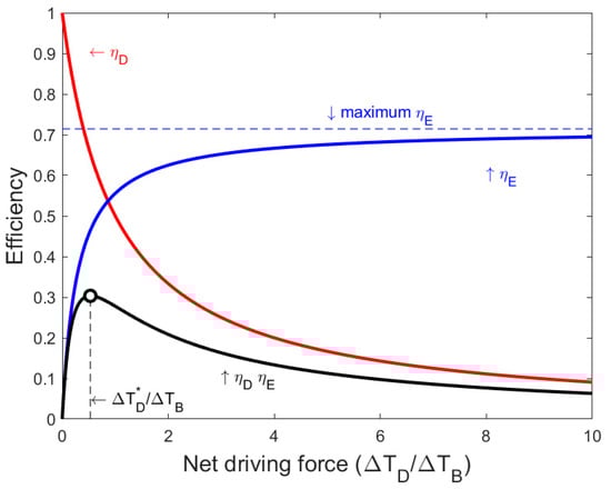 Figure 3 shows the efficiency as a function of the membrane parameter and the chosen net driving temperature. The previous figure (Figure 2) corresponds to a vertical line at in this plot, showing that the maximum efficiency occurs for every value of the membrane parameter. This maximum is represented in Figure 3 by the curve (Equation (17)) that divides the chart into two areas. In the lower area, both the efficiency and productivity can be improved by increasing the net driving temperature. In the upper area, there is a trade-off between improving the productivity and reducing the efficiency. A rational operational strategy will prefer a favorable trade-off between the heat requirement and production rate and thus will avoid the lower area. Thus, from an operational perspective, a net driving temperature higher than the net driving temperature difference that maximizes efficiency () should be chosen.