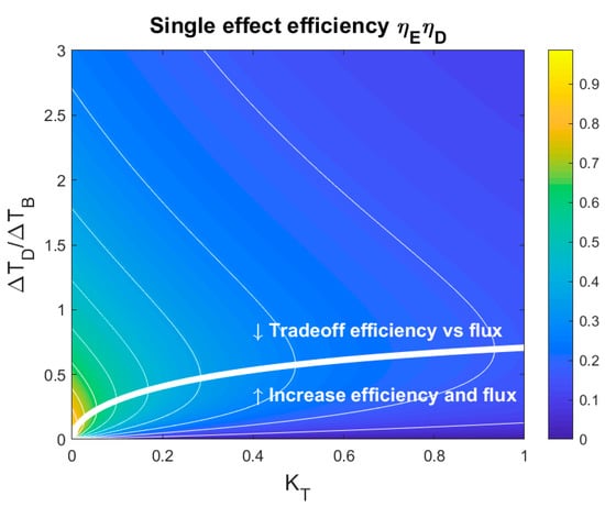 Single effect efficiency as a function of the membrane parameter (KT) and the net driving temperature, under the assumption that the heat-transfer resistance in the boundary layers is negligible (KTP,KHX ≫ KT). The white line shows the relation between the membrane parameter and the net driving temperature that maximizes the efficiency, and divides the area into two zones. In the lower zone, both the thermal efficiency and productivity may be improved by choosing a larger net driving temperature difference. In the upper zone, there is a trade-off between increasing the flux and lowering the thermal efficiency. A rational operational strategy will prefer an economically favorable trade-off between the heat consumption and productivity and thus will avoid the lower zone.