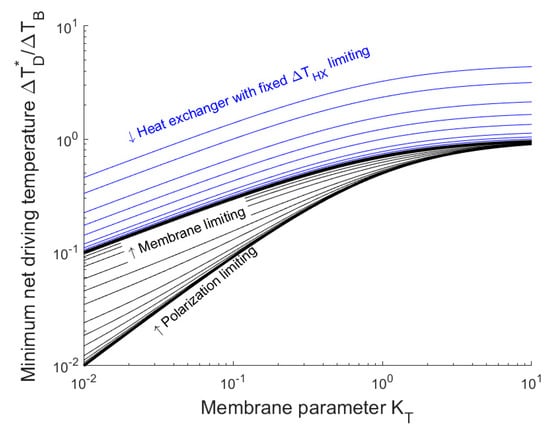 Minimum net driving temperature as a function of the membrane parameter, the heat exchanger parameter, and the temperature polarization parameter. The black lines correspond to the assumption that the temperature difference over the heat exchanger and temperature polarization is proportional to the net driving temperature, with various values of the parameter KHX and KTP. The thick lines correspond to the extreme scenarios outlined in Equation (17). The blue lines correspond to the assumption that the temperature difference over the heat exchanger is fixed, from top to bottom: ΔTHX/ΔTB = 10, 5, 2, 1, 0.5, etc.