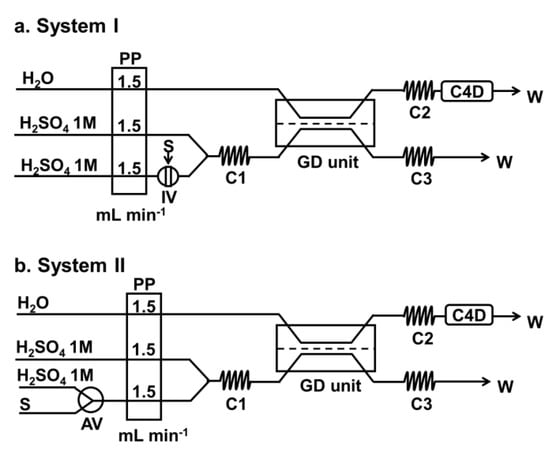 Figure 1 shows the two flow systems used in this work for analysis of the two types of samples, i.e., clear liquid and turbid samples. System I is the flow-injection analysis (FIA) system suitable for clear samples and was employed for optimizing various flow parameters (see Section 3). System II is the flow system employed for the final developed method for analysis of turbid and clear samples. Both systems are coupled with an in-line gas-diffusion (GD) unit and a capacitively coupled contactless conductivity detector (C4D).