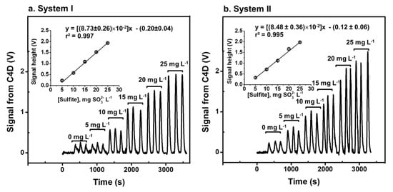 Signal profiles of standard sulfite solutions obtained from (a) System I and (b) System II. Insets are the linear calibration graphs after the subtraction of reagent blank signal (0 mg SO32− L−1).