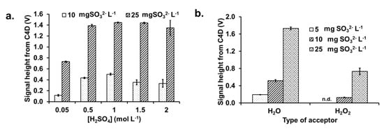 Bar graphs of the effect of (a) sulfuric acid concentration in the donor stream and (b) the type of acceptor solution on C4D signal heights. n.d.: not detected.