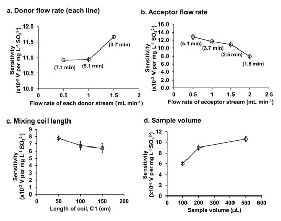 The flow rate of each donor streams was varied from 0.5 to 1.5 mL min−1, with the flow rate of acceptor line fixed at 1.0 mL min−1. Figure 4a shows that increasing the flow rate of donor stream gave an increase in the sensitivity. Moreover, higher flow rate also reduced the analysis time (see the numbers in parenthesis in Figure 4a). Therefore, the flow rate of 1.5 mL min−1 was selected as the optimum flow rate of each donor line.