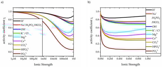 where and, F is the Faraday constant (96,488.46 C/mol), R is the ideal gas constant (8.3143 J/mol/K), T is the temperature (310 K), stands for the electronic charge (1.602 × 10−19 C), is the permittivity of the medium ( F/m, for water), and ai represents the radius of hydrated ion (values according to Kielland []).