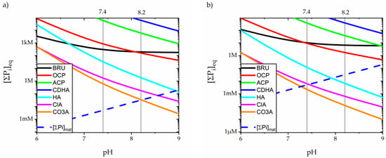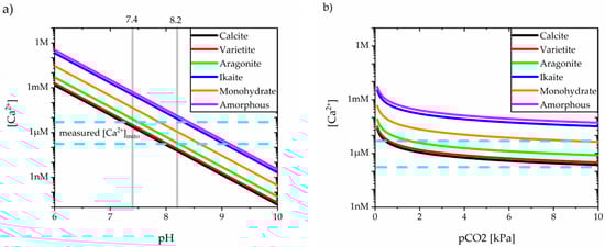 Although the first attempts to quantify the solubility of calcium carbonates in aqueous systems date back to the middle of the 19th century [,] and despite the many efforts with current advanced ionic interaction models available, there are still no universally accepted values of the solubility constants of the calcium carbonate forms []. Values of the solubility products for various forms of CaCO3 and their activity products are presented in Table 2. Using these values, one can calculate the equilibrium concentration of free calcium in the solutions of respective salts as functions of pH and partial pressure of carbon dioxide.