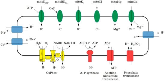 Ion channels, exchangers, pumps and oxidative phosphorylation chain of the inner mitochondrial membrane: green—uniporters, blue—exchangers, yellow—four complexes of oxidative phosphorylation chain, and red—ATP synthasome. There are more than one type of mitoBKCa, mitoKv or mitoCl channels.