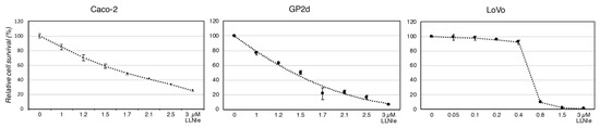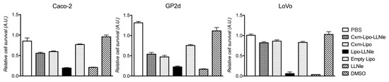 3.3. LLNle-Liposomes Reduce Cell Survival of CRC Cell Lines and Show Higher Inhibition Activity Compared to Immunoliposomes-LLNle
