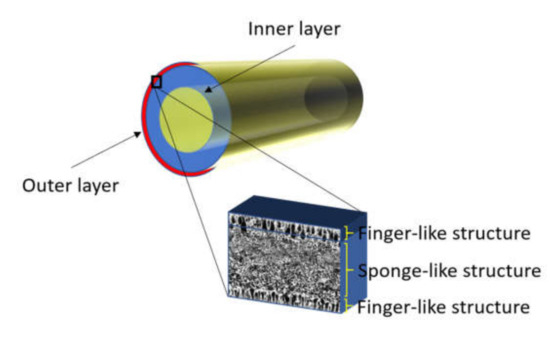 On the other hand, dual-layer hollow fiber (DLHF) membranes have attracted great interest due to its potential to improve water flux, reduce material cost through the usage of less costly material as substrate, and improve antifouling performance through the addition of nanoparticles [27,28,29]. The presence of immobilized TiO2 nanoparticles in the PVDF outer layer of the DLHF membrane promoted the formation of microporous structure which allowed uniform nanoparticles dispersion [30,31].
