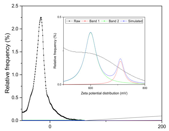 The zeta potential of the nanoparticles was –16.5 mV as shown in Figure 2. The nanoparticles with the above feature are subjected to low stability of the colloidal suspension which was expected to be based on electrostatic considerations. In general, there is a probability of particle aggregation that might affect suspension stability in the dispersion medium [46,47,48]. Two deconvolution peaks were observed at 600 mV and 710 mV.