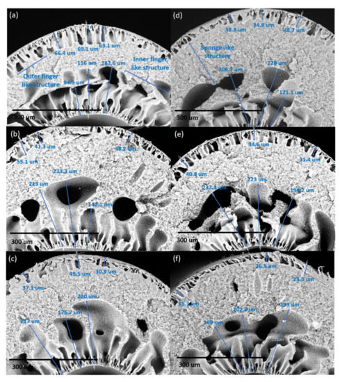 The length of the finger-like structure at the outer layer of DL-ZT0 as shown in Figure 6a–f was measured as 65.0 ± 3.3, 63.0 ± 2.2, 44.5 ± 8.1, 37.6 ± 1.3, 37.9 ± 5.3 and 32.1 ± 5.1 µm for the air gap length of 5 cm (DL-ZT0-05), 10 cm (DL-ZT0-10), 20 cm (DL-ZT0-20), 30 cm (DL-ZT0-30), 40 cm(DL-ZT0-40), and 50 cm (DL-ZT0-50), respectively. Meanwhile, the length of the finger-like structure at the outer layer of DL-ZT1 as shown in Figure 7a–f showed a similar trend of reduction in the finger-like size measured as 66.2 ± 3.0, 48.2 ± 6.9, 39.2 ± 9.5, 40.6 ± 7.2, 35.6 ± 4.8 and 28.4±6.1 µm at similar air gap of 5 cm (DL-ZT1-05), 10 cm (DL-ZT1-10), 20 cm (DL-ZT1-20), 30 cm (DL-ZT1-30), 40 cm (DL-ZT1-40) and 50 cm (DL-ZT1-50), respectively. The finger-like structure at the outer layer of DL-ZT0 (except DL-ZT0-05 and DL-ZT0-30) is longer than that of DL-ZT1. On the other hand, the non-uniform finger-like structure at the inner layer of DL-ZT0 decreased from the average of 151 to 132 µm when the air gap was increased from 5 to 50 cm. However, an opposite trend was observed in DL-ZT1 with an increasing finger-like size from the average of 138 to 208 µm.