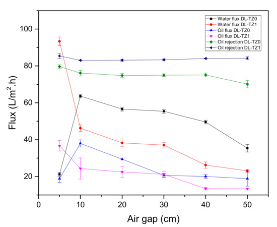 Figure 10 shows the performance of DL-ZT0 and DL-ZT1 spun at a different air gap for oily wastewater treatment. The water flux of DL-ZT0-05, DL-ZT0-10, DL-ZT0-20, DL-ZT0-30, DL-ZT0-40, and DL-ZT0-50 was 21.2, 63.7, 56.6, 55.4, 49.5, and 35.4 L/m2.h, respectively. Meanwhile, the water flux of DL-ZT1-05, DL-ZT1-10, DL-ZT1-20, DL-ZT1-30, DL-ZT1-40, and DL-ZT1-50 was 93.4, 46.2, 38.3, 37.0, 26.2, and 23.1 L/m2.h, respectively. The water flux of DL-ZT1-05 recorded the highest reading and improved by about 341% from the water flux of DL-ZT0-05 before exhibited the decreasing trend. The same trend was observed in the oily wastewater flux but at a much lower reading. The oily wastewater flux of DL-ZT0-05, DL-ZT0-10, DL-ZT0-20, DL-ZT0-30, DL-ZT0-40, and DL-ZT0-50 was 18.9, 38.0, 29.4, 20.7, 20.0, and 18.9 L/m2.h, respectively. On the other hand, the oily wastewater flux of DL-ZT1-05, DL-ZT1-10, DL-ZT1-20, DL-ZT1-30, DL-ZT1-40, and DL-ZT1-50 was 36.7, 24.4, 22.5, 21.2, 13.5, and 13.4 L/m2.h, respectively. The result showed that the oily wastewater flux of DL-ZT1-05 recorded the highest reading and surpassed the oily wastewater flux of DL-ZT0-05 by 94.2% before dropping further as the air gap increased.