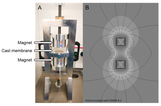 (A) The magnetic alignment setup. The nitrogen box is placed in the middle of two magnets from which both their magnetic north pole is faced upwards. (B) Simulation of the obtained non-homogeneous magnetic field lines with a gap of 80 mm between the magnets.
