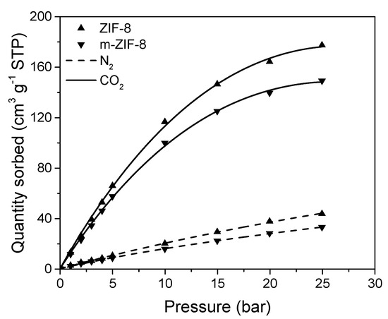 The effect of the incorporation of Fe3O4 on the N2 and CO2 sorption in m–ZIF−8 is shown in Figure 6 and confirms the observation made for the decrease in BET surface area of m–ZIF−8. Since Fe3O4 has no microporosity, a decrease in both N2 and CO2 sorption is observed when Fe3O4 is incorporated in ZIF−8. The sorption of N2 in ZIF−8 and m–ZIF−8 shows Henry sorption behavior, since almost linear sorption behavior is observed. On the other hand, Langmuir sorption behavior is observed for CO2 in both ZIF types, since the slope of sorption decreases over the whole pressure range. Clearly, higher quantities of CO2 are sorbed in both ZIF structures than N2. This indicates that the sorption of CO2 is thermodynamically favored over N2 sorption, which was also observed for another ZIF type [42]. Moreover, the observed sorption ratio of the two gases corresponds with simulated ratios of sorption of ZIF−8 at 25 °C [43].