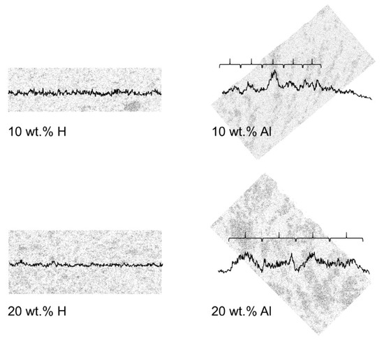 Particle count of Zn EDS maps (color inversed with respect to Figure 8) of 10 wt.% H, 10 wt.% Al, 20 wt.% H and 20 wt.% Al MMMs. The curly brackets display the approximate periodicity of the alignment.