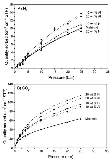 (A) N2 and (B) CO2 sorption of Matrimid, 10 wt.% H, 10 wt.% Al, 20 wt.% H and 20 wt.% Al MMMs.