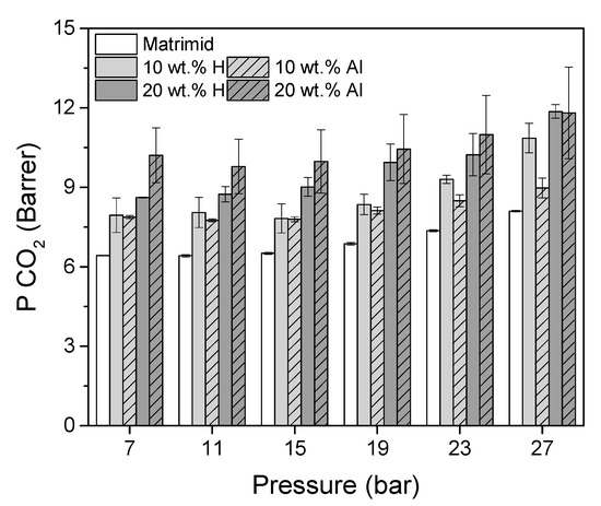Single gas CO2 permeability (PCO2) of Matrimid, 10 wt.% H, 10 wt.% Al, 20 wt.% H and 20 wt.% Al MMMs as function of pressure.