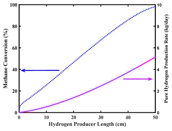Methane conversion and pure hydrogen production rate of the MR, Pd-Ag membrane thickness = 50 µm, water to methane ratio = 2.5, inlet temperature = 500 °C, and inlet pressure = 10 bar.