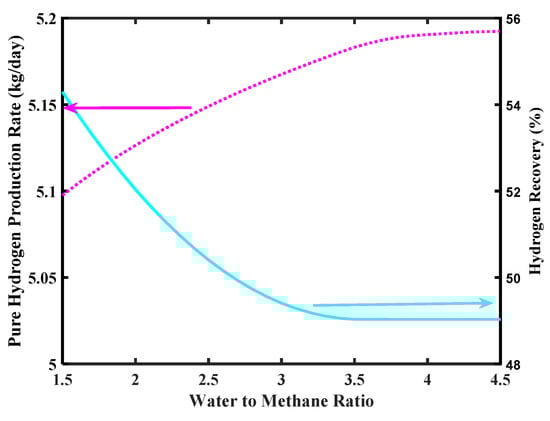 Pure H2 production rate and hydrogen recovery ratio versus water to methane ratio, Pd-Ag membrane thickness = 50 µm, inlet temperature = 500 °C, and inlet pressure = 10 bar.