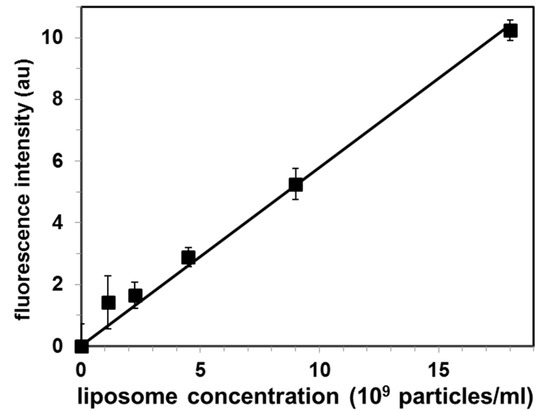 Calibration curve for quantification of exosomal liposomes by the proposed Cholera toxin subunit B (CTB)-gel filtration method. Values are mean ± SE of 3 independent experiments. Fluorescence intensity is in arbitrary units (au).