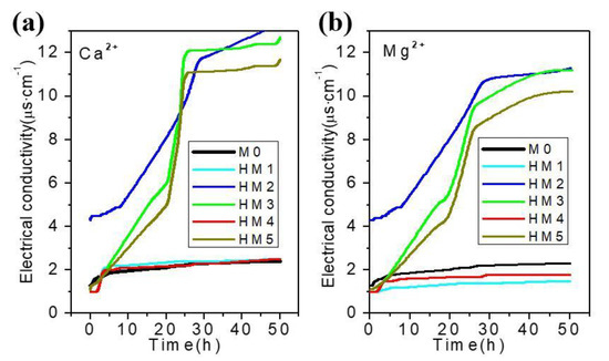 Electrical conductivity of Ca2+ (a) and Mg2+ (b) in blank membrane (M0) and organic–inorganic hybrid ion channel membranes (HM1–HM5) as a function of time.