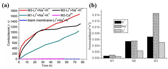 (a) Electrical conductivity of Li+, Na+, and K+ in M0 and HM1–HM5; (b) permeability values of Li+, Na+, and K+ cations in HM1–HM5.