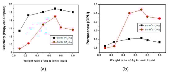 Separation performance: (a) mixed gas selectivity and (b) total permeance of BMIM+BF4− and BMIM+PF6− membranes with various weight ratios of silver nanoparticles.