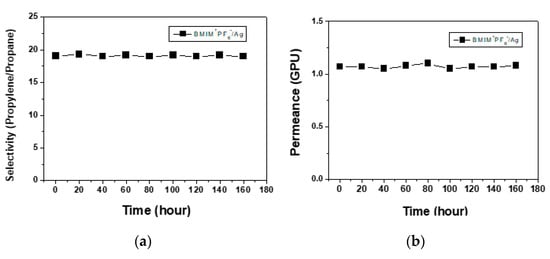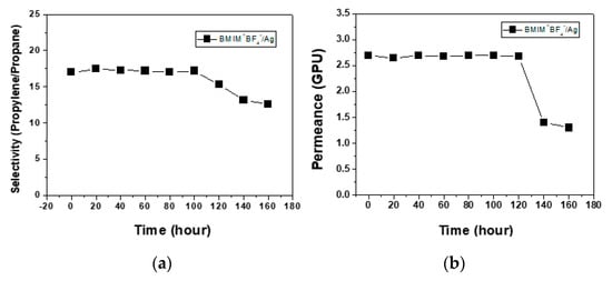 The stability of BMIM+BF4− and BMIM+PF6−/Ag composite membranes was also tested by measuring the separation performances of propylene/propane mixtures for up to 160 h. Figure 2 and Figure 3 show the selectivity and mixed gas permeance with respect to propylene/propane of the BMIM+BF4− and BMIM+PF6− membranes containing the silver nanoparticles, respectively. The weight ratio of silver nanoparticles to ionic liquid was fixed at 1/0.7. The BMIM+BF4−/Ag composite membrane showed stability up to 100 h, but decreased after 100 h, possibly due to the particle aggregation in the membrane. It was thought that these aggregation phenomena of Ag nanoparticles in BMIM+BF4− was attributable to the relatively weak interaction between the surface of the metal and the hydrophilic ionic liquid since the utilized metal had hydrophobic properties.