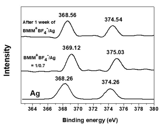 Binding energy of Ag in 1/0.7 BMIM+BF4−/Ag composites after preparation and after 1 week.