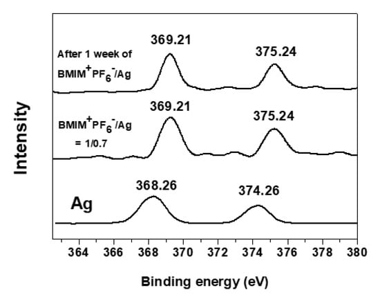 Binding energy of Ag in 1/0.7 BMIM+PF6−/Ag composites after preparation and after 1 week.