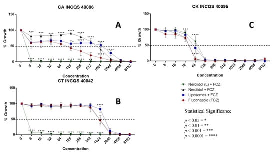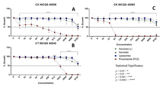 Growth curves of different Candida strains in the presence of fluconazole (FCZ), nerolidol and liposomal nerolidol (L). Liposomes without nerolidol were used as controls. (A) CA—Candida albicans; (B) CT—Candida tropicalis; (C) CK—Candida krusei; INCQS—National Institute for Quality Control in Health; concentration in µg/mL.