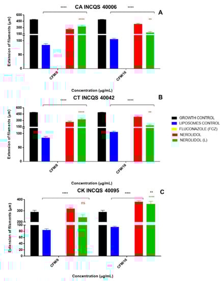 To investigate the effects of the treatments of fungal morphology, the development of hyphae was analyzed by optical microscopy in chambers containing sterile slides for the observation of yeasts, as previously described [30,31]. To this end, the chambers were added with 3 mL of PDA medium depleted by dilution, in the presence of nerolidol at concentrations equivalent to its MFC/8 or MFC/16. Aliquots of the subcultures were removed from the Petri dishes to make two parallel streaks in the solid medium (PDA), which were later covered with a sterile coverslip. The chambers were then placed in the oven at 37 °C for 24 h, and the images were recorded under optical microscopy (AXIO IMAGER M2-3525001980, ZEISS, Germany). Each slide was photographed and the length of the filament extensions (hyphae and pseudohyphae) was determined using the Zen 2.0 software [32].