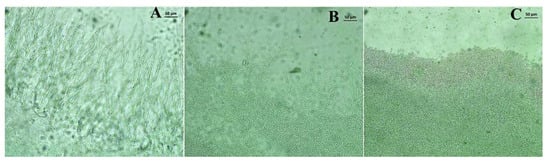 Optical microscopy images showing the effects of different treatments on the growth of fungal filaments. (A) Control; (B) nerolidol (CFM/8); (C) fluconazole CFM/8.