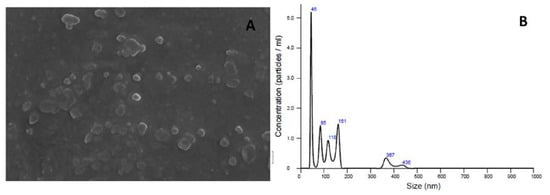 The morphological analysis of the liposomes by scanning electron microscopy (SEM) (Figure 5A) revealed the presence of homogeneous populations of spherical vesicles with similar dimensions. Figure 5B shows the distribution of the vesicles considering their size and concentration/mL.