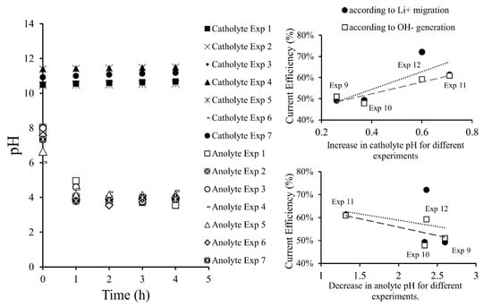 24], by means of bipolar membrane electrodialysis, studied simultaneous recovery of lithium and boron from aqueous solutions at different applied voltages, reporting recovery efficiencies higher than 90%. They indicated that the current efficiency decreases with applied voltage.