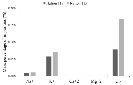 Nafion 115 and Nafion 117 membranes (DuPont Co., Wilmington, DE, USA) were used, with an effective area of 12 cm2. These membranes differ on the number of repeating monomer units and thickness, which were 0.13 and 0.18 mm, respectively. Membranes were pre-conditioned by an immersion technique phase in a solution of LiOH 2.30 wt% for 72 h at room temperature. Before each experiment, membranes were washed with distilled water.