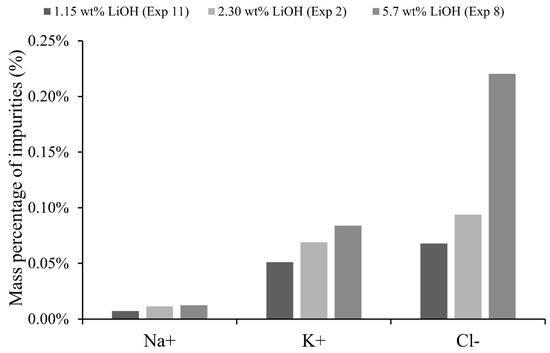 29], obtaining at best a result of 5 kWh/kg LiOH from a similar initial catholyte concentration (approximately 2.4 wt% LiOH). Our specific electrical consumption results were similar to those previously reported. In relation to the amount of impurities obtained in other studies, Brown [