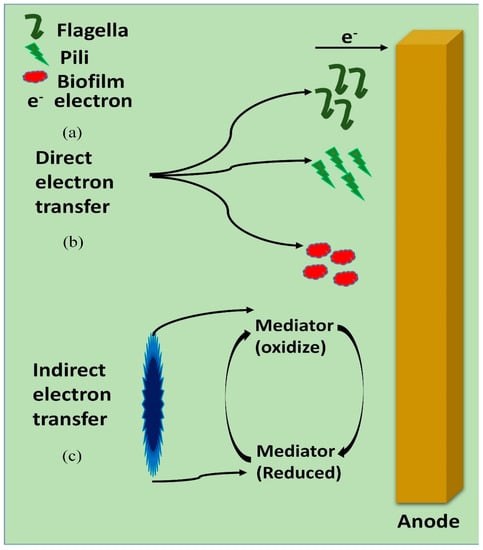 The electrons transmission mechanism is essential in order to acquire a flawless knowledge for the application of BMFC at a large scale. In the anodic chamber of BMFC, organic substrates are reduced by microbes and transfer electrons to anodes, from where the electrons move to the cathode through external circuit to generate electricity [27]. Earlier, the microbes were exploited in the anodic chamber, but recently microbes are also exploited as biocathodes in the cathodic region to assist electrons transmission to the terminal electron acceptor (TEA) [28,29]. The power density, current density and coulombic efficiency can be measured by electron transfer rate. If the electrons transfer rate is higher than the electrons passing through the external circuit, more coulombic efficiency, power density and current density will be measured, leading to higher voltage production. The harvested bioenergy produced by the electron transfer towards electrodes from the respiration chain of electrogens is known as a new BMFC technology [30]. There are two means of electrons transfer in BMFC occupied by microbes: (i) direct electron transfer (direct contact between the microbes and the electrode surface) and (ii) indirect electron transfer (through the so-called electron mediators), as shown in Figure 3.