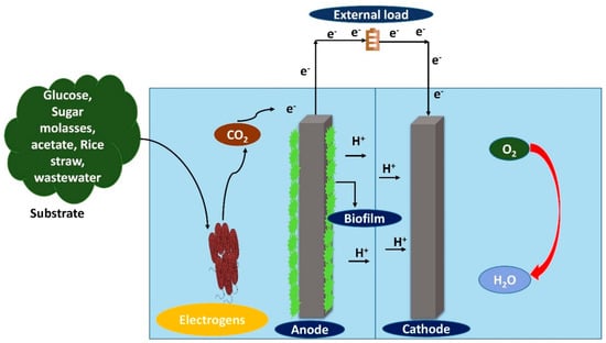 In BMFC, the chemical reaction is replaced by a microbial reaction where the organic substrates are utilized as fuel for feeding the microbes and generating renewable energy. All these microorganisms that grow are nourished by varieties of substrates, which include simple carbohydrates or polysaccharides, amino acids, organic acids, cellulose and lignocellulose [95]. Marine sediments and aqueous ones were also employed in BMFC as a substrate [116]. The substrate not only facilitates the microbes in producing the biofilm on the surface of the anode, but is also designed to increase the performance of the BMFC by producing higher coulombic efficiency and power density [117]. Moreover, the diverse substrate processes fully depend on the biodegradability factor. The power density of BMFC is directly proportional to the quantity of organic contents in the organic substrate and the biodegradation by electrogens of the microorganism [118]. The mechanism of organic substrate degradation through electrogens using BMFC is shown in Figure 4.