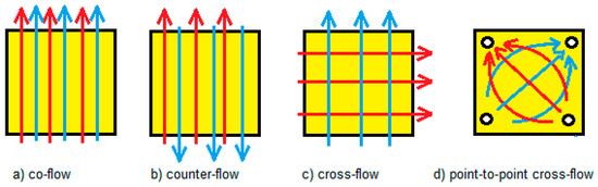 Different flow directions in a RED stack: co-flow (a), counterflow (b), side-to-side crossflow (c), and point-to-point cross-flow (d). Red arrows indicate the flow direction in the river water compartments and blue arrows the direction in the seawater compartments.