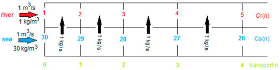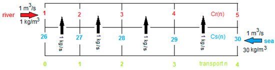 with Cs(n) and Cr(n) the location dependent concentrations in the sea and river water compartments, Csi the sea water inlet concentration and Cro the river water outlet concentration.