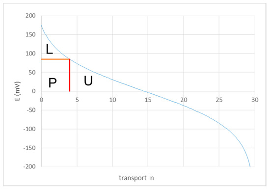 Figure 4 shows the EMF E as function of the transport parameter n according to Equation (9). In RED applications, only a part of the sketched EMF curvature applies. Only with a strong negative applied potential, the complete curvature can be constructed; this RED method is known as ARED (assisted reverse electrodialysis) [25]. In normal RED operation the stack is connected with an Ohmic load, resulting in a clamp voltage Uc which is lower than the EMF E. In Figure 4 the clamp voltage is 85 mV, corresponding to a transport of about 4 kg/s. As stated earlier, the sections of equal transport in the stack increase in the direction of the flow and the final part (with n from 4 to 5 kg/s) is even infinitely long. Therefore, the outlet R concentration will be a little below 5 kg/m3.