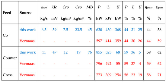 Here, Cri and Csi are inlet concentrations. By maximizing P, the optimal n (nopt) can be easily found; with inlet concentrations of 1 and 30 kg/m3, the value of nopt is 6.495. The corresponding clamp voltage Uc is 59 mV and the delivered power P is 630 kW. Percentages of the different values are compared with data from Vermaas et al. [12] in Figure 7. The values of our simple model—in fact only Equation (12)—differ only marginally from the sophisticated model of Vermaas et al. differences.