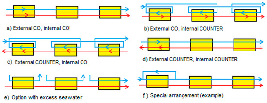 Different multistage systems. Systems externally operated in (a,b) co-flow mode; (c,d) counterflow mode. Internal co-flow is seen in (a,c), whereas internal counterflow occurs in (b,d). Systems (a–d) are the subject of this article. System (e) is an option if there is a large excess of seawater (blue flow paths) available. System (f) is an example of numerous other interconnections and is taken from Tedesco et al. [13].