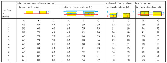 All calculated efficiencies are listed in Figure 9. The highest energy efficiencies appear in arrangement (b), (co-flow of stacks with internal counterflow). Moreover, within arrangement (b), optimization method B result in a little higher values than method C. However, the advantage of method B (each stack the same electrical current) is that all stacks can be connected in series, and only one convertor is needed for delivering the power to the local network.