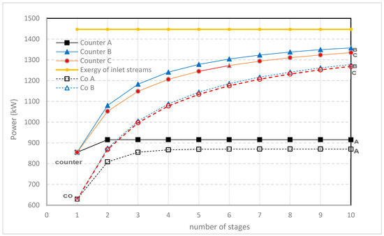 Power in kW with multistaging in co-flow stacks (dashed lines; added to aid interpretation) and counterflow stacks (solid lines). Stacks are external connected in co-flow. Feed-water-flow rate is 1 m3/s, concentrations 1 and 30 kg/m3. Three different optimizing methods (A, B and C) are used (see caption Figure 9).